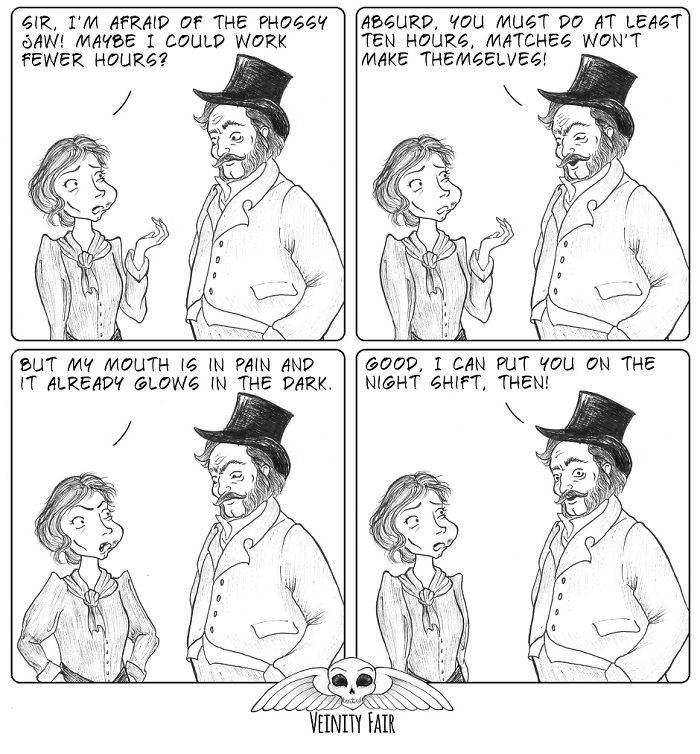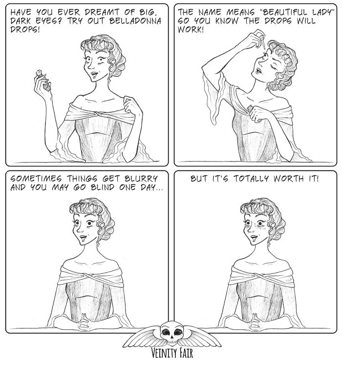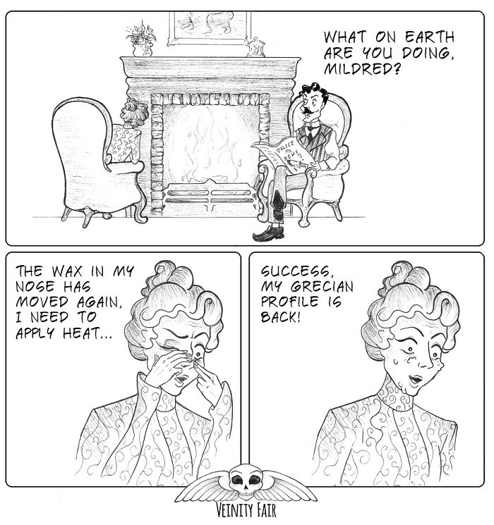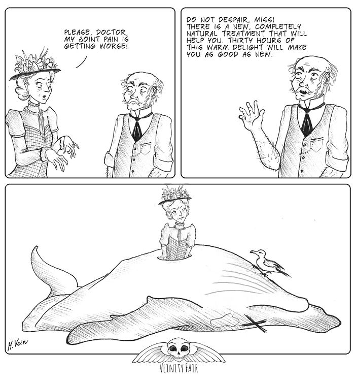 Chciałam dzielić się tymi historiami, jednak szybko odkryłam, że nie każdy ma ochotę rozmawiać o upuszczaniu krwi czy dawnej bieliźnie podczas przerwy na lunch. Dlatego powstało Veinity Fair — webkomiksy pełne nietypowych ciekawostek i czarnego humoru, napędzane morbidną ciekawością!