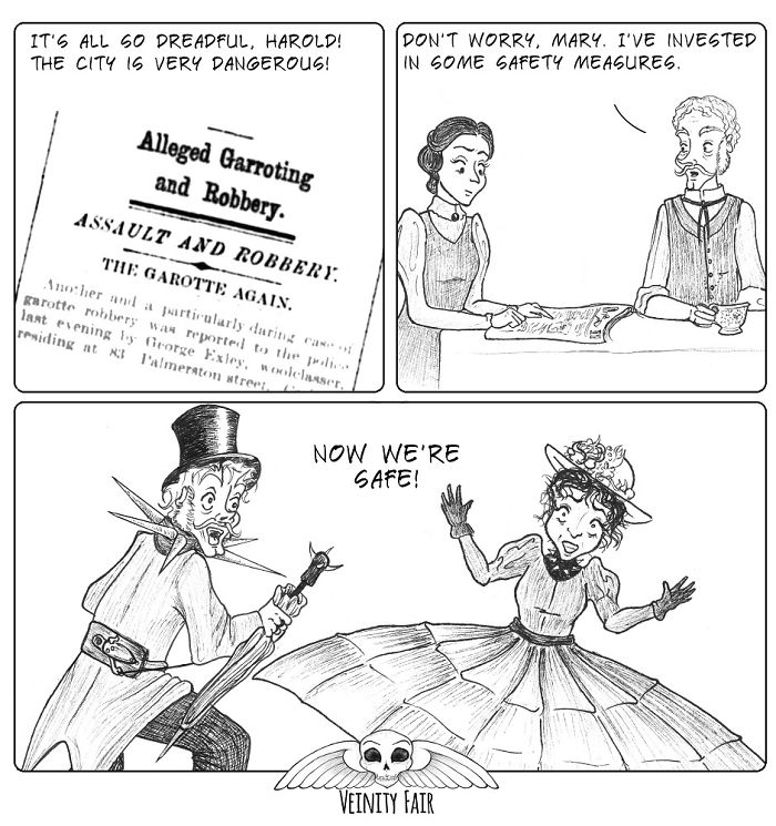 W połowie XIX wieku w kilku dużych miastach pojawiły się paniki związane z tzw. garrottingiem — brutalnymi napadami duszenia. Strach społeczny wykorzystywali niektórzy przedsiębiorczy ludzie, którzy znajdowali na tym sposób, by zarobić lub rozkręcić sensację.