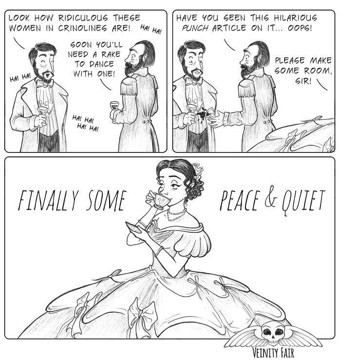 Krinoliny zyskały ogromną popularność w drugiej połowie XIX wieku. Lekkie stelaże pozwalały kobietom uzyskać ogromne kształty sukien bez noszenia ciężkich halk. Moda ta stała się masowym zjawiskiem — mówiono nawet o „krinolinomanii” i rysowano liczne karykatury. Choć krinoliny niosły ze sobą pewne niebezpieczeństwa — szczególnie w fabrykach lub przy otwartym ogniu — dawały też kobietom coś na kształt prywatnej przestrzeni.