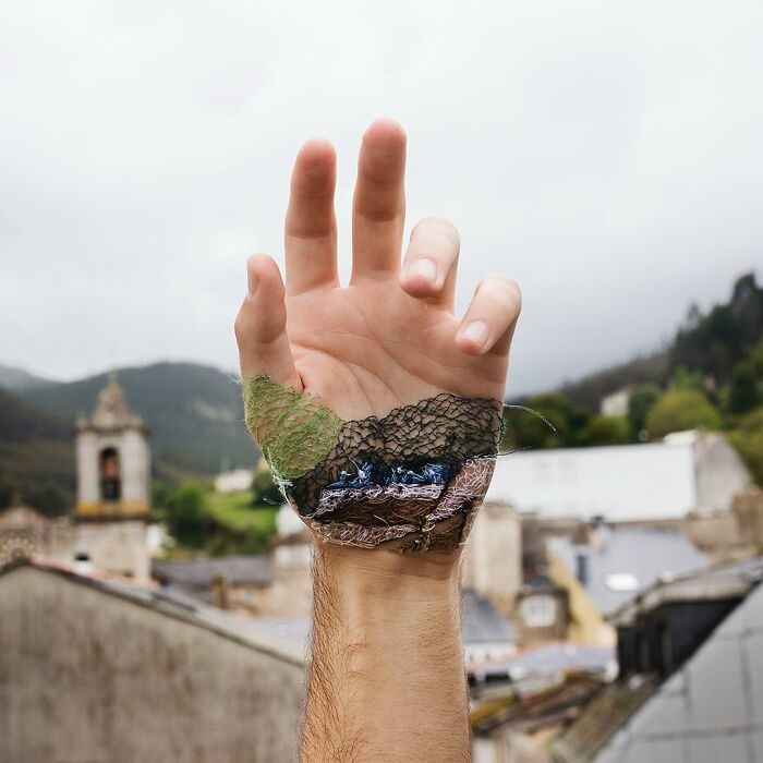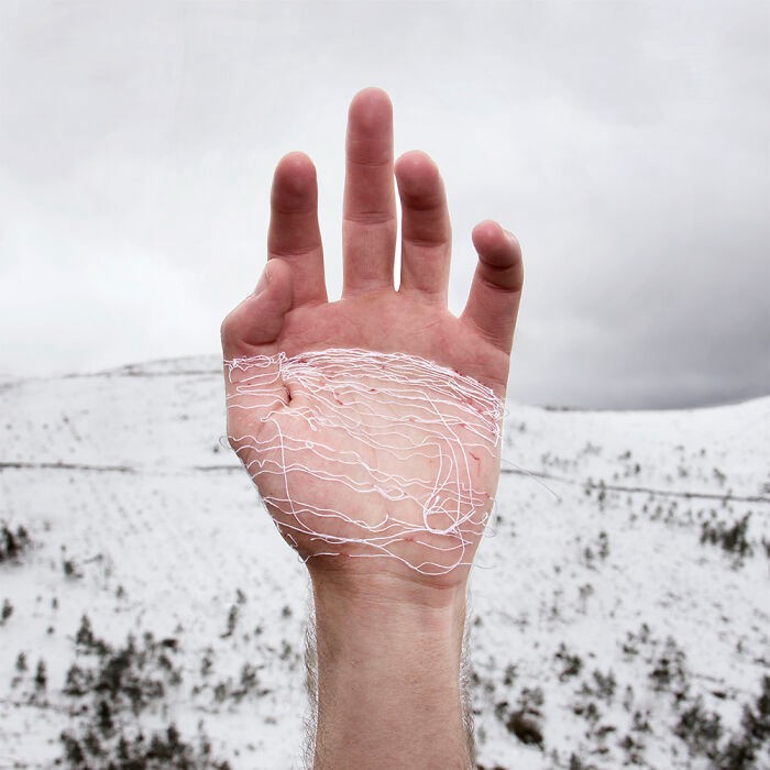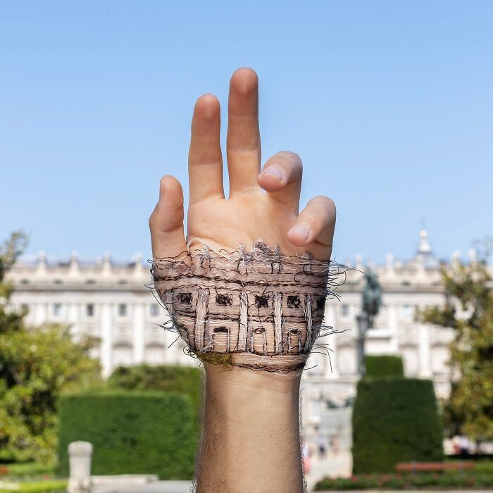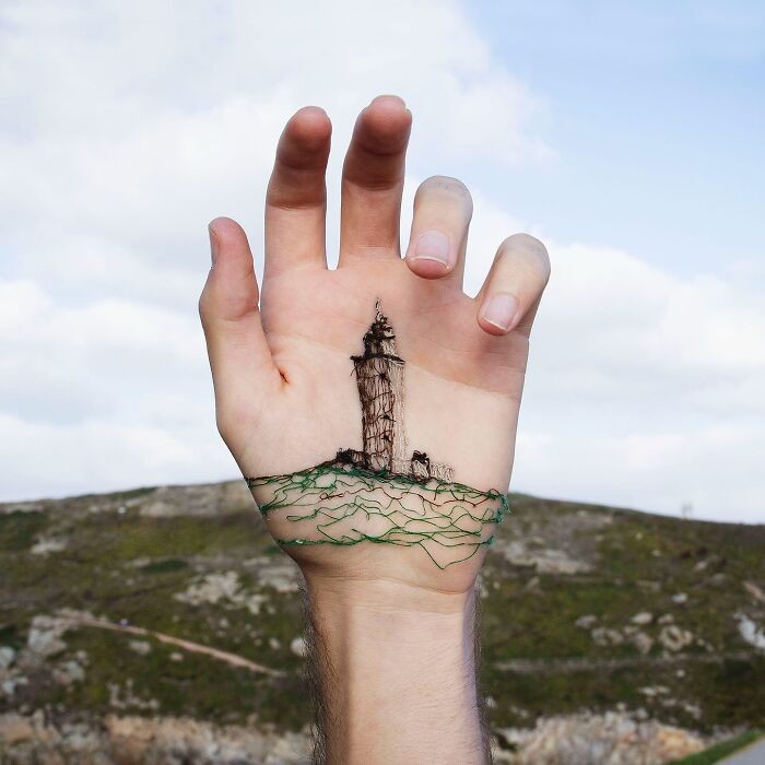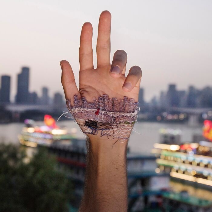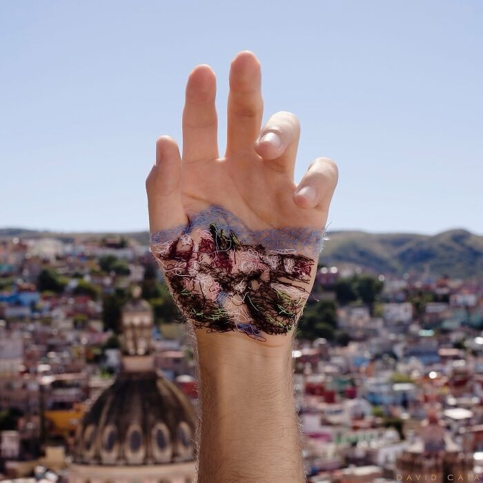 Hiszpański artysta David Catá tworzy sztukę, układając materiały na swojej dłoni. Używa nici do zszywania obrazów, które są dla niego ważne, przemieniając swoje wspomnienia i uczucia w coś, co można zobaczyć i poczuć.