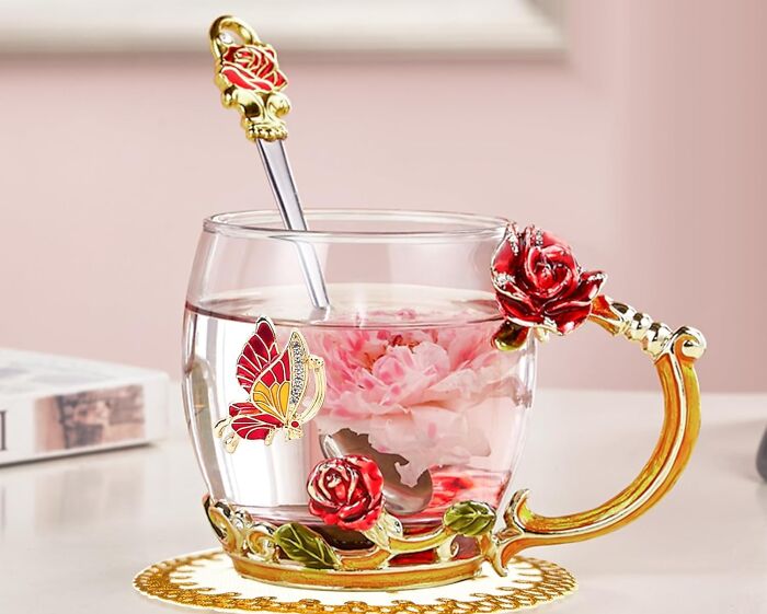 Mama może popijać Earl Grey jak na spotkaniu z Lady Whistledown, dzięki tej delikatnej, eleganckiej szklanej filiżance