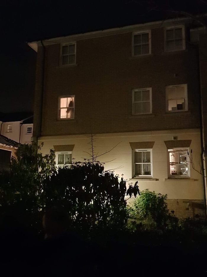 Po chwili paniki okazało się, że to tylko gazeciarz z gałęzią — próbował odzyskać gazetę rzuconą na dach i wyglądał przerażająco.
