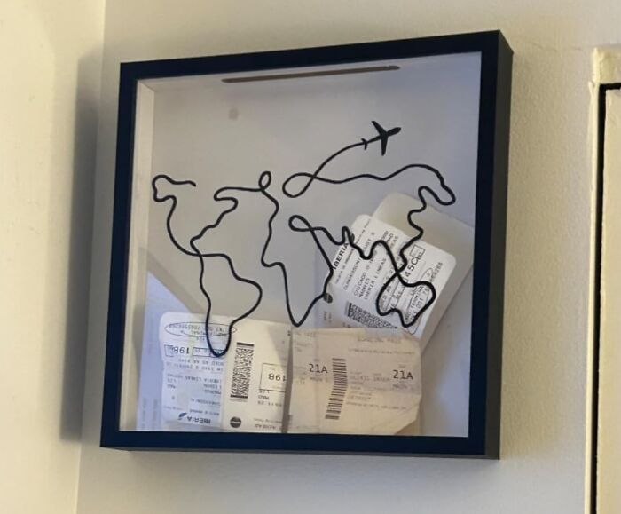 Ramka-shadowbox na bilety i drobiazgi z podróży pozwala zmienić zbiory w stylową dekorację ścienną — zamiast trzymać wszystko w walizce, stworzysz ekspozycję w stylu Pinterest.