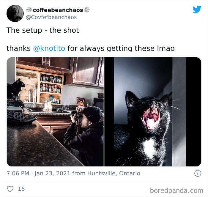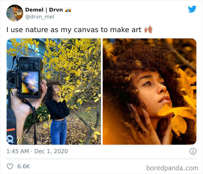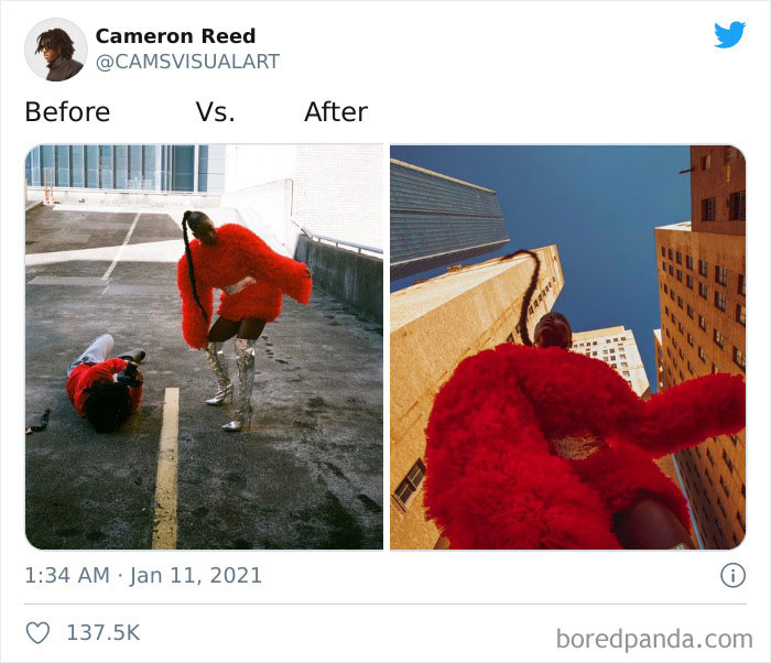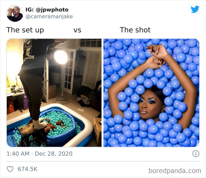 Trend „Ustawienie kontra zdjęcie” rozwinął się mniej niż rok temu — fotografowie i twórcy chętnie publikowali zdjęcia zza kulis obok finalnych kadrów. Pokazał on, że nie potrzeba drogiego sprzętu, żeby uzyskać efekt jak z okładki magazynu — liczy się pomysłowość i dobre oko.