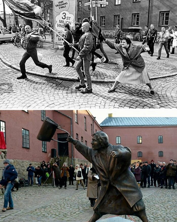 Zdjęcie przedstawia Danutę Danielsson, która uderza torebką uczestnika neonazistowskiego marszu. Danielsson, wywodząca się z polsko‑żydowskiej rodziny, zdecydowała się pozostać anonimowa z obawy przed zemstą. Jej czyn stał się symbolem oporu wobec nienawiści; po latach odsłonięto pomnik upamiętniający jej odwagę.