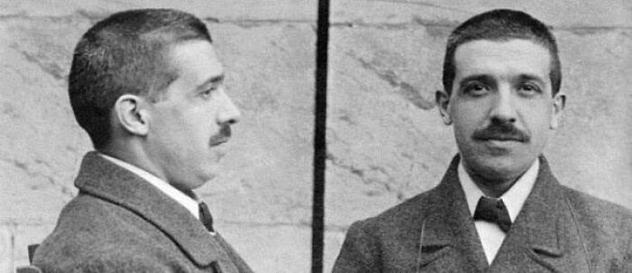 Klasyczny przykład piramidy finansowej. Charles Ponzi obiecywał ogromne zyski z handlu międzynarodowymi kuponami pocztowymi, ale wypłacał pieniądze wcześniejszym inwestorom z wpłat nowych klientów. Schemat działał krótko, zanim skończył się procesem i karą więzienia — stał się jednak terminem opisującym podobne oszustwa do dziś.