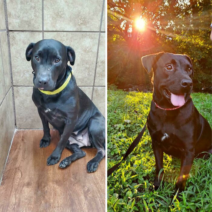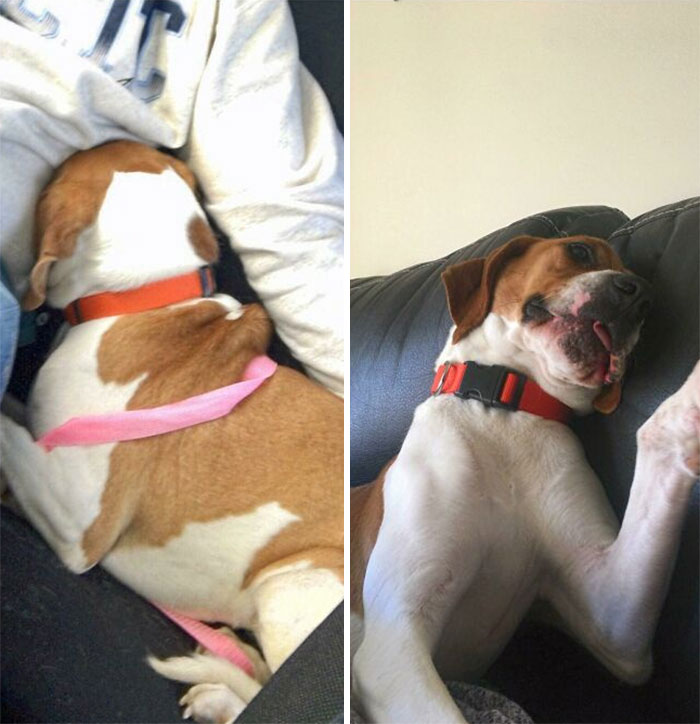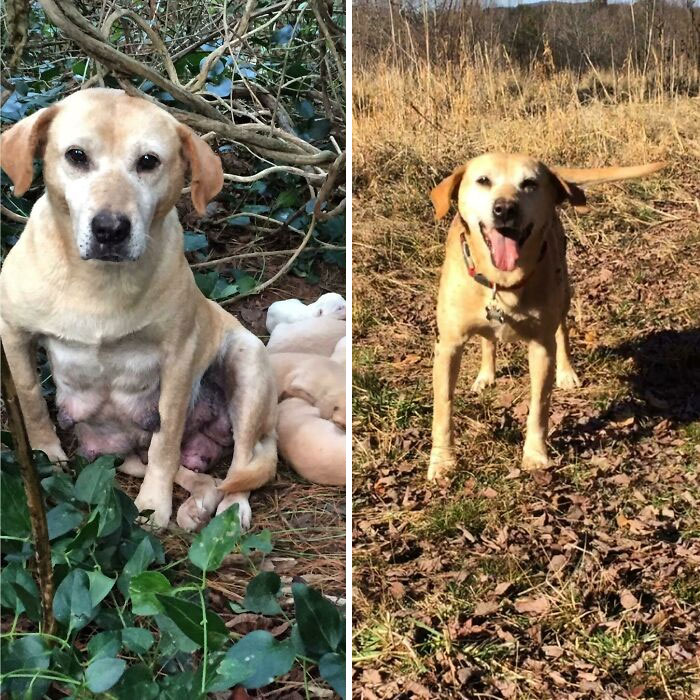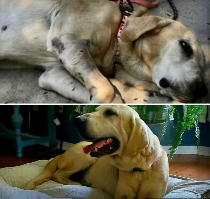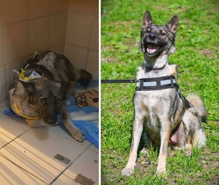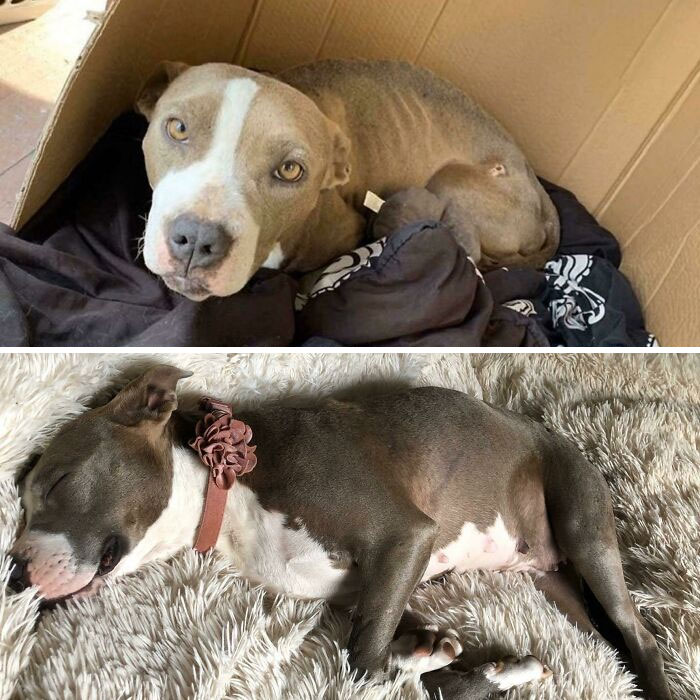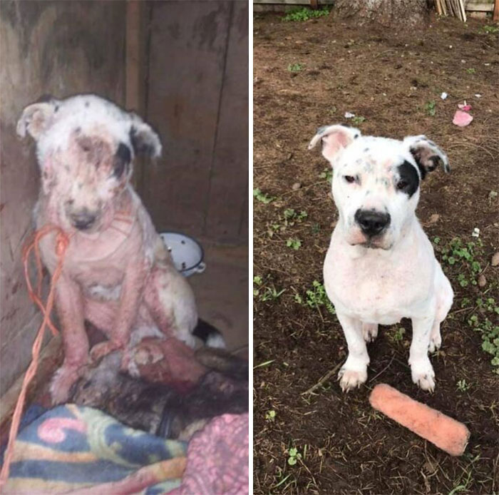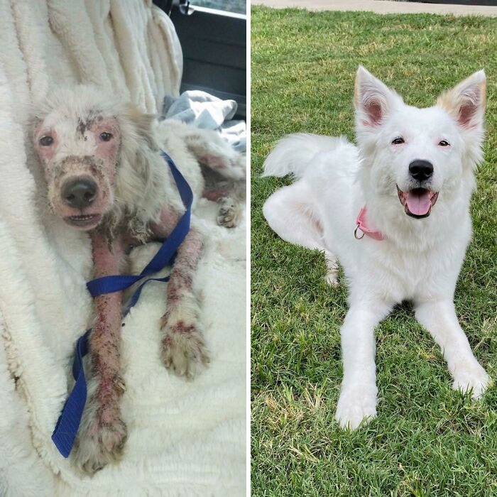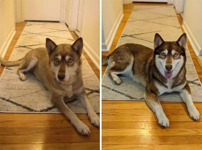 Zdjęcia dokumentujące przemianę pokazują, że czas i bezpieczeństwo to najlepsze lekarstwo dla porzuconych psiaków.