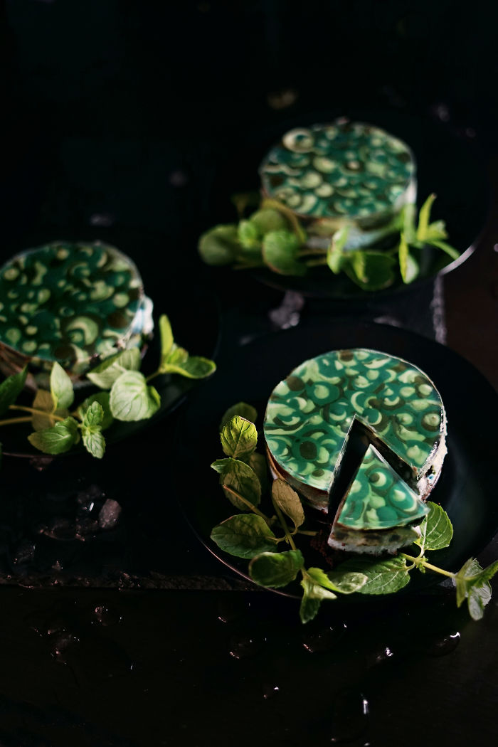Roślinne serniczki miętowe stylizowane na malachit — jego wzory i odcienie przeniosłam na krem za pomocą naturalnych barwników.
