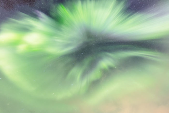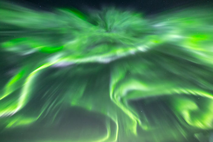 Przy tak silnej zorzy trudno dostrzec gwiazdy — światła grają pierwsze skrzypce.