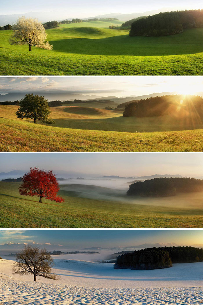 Jozef Morgoš fotografował tę samą czereśnię w miejscowości Žabokreky na Słowacji przez cały rok. Zmiany pór roku uwypuklają jej wytrwałość i malowniczość okolicy.