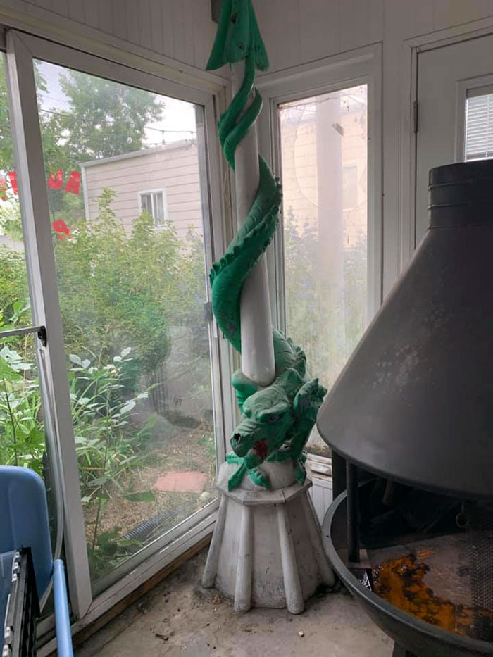 Miał kiedyś służyć jako wierzchołek namiotu cyrkowego. Dostałem go od faceta, którego wuj miał jedno z domów PT Barnuma w Denver. Dałem mu kilka porad nieruchomościowych, on oddał smoka. Ma otwór w pysku na dym i miejsce na język, którego brakuje. Lekki i był porzucony na podwórku przez lata — wyobrażam sobie, że objeżdżał świat w pokazach.
