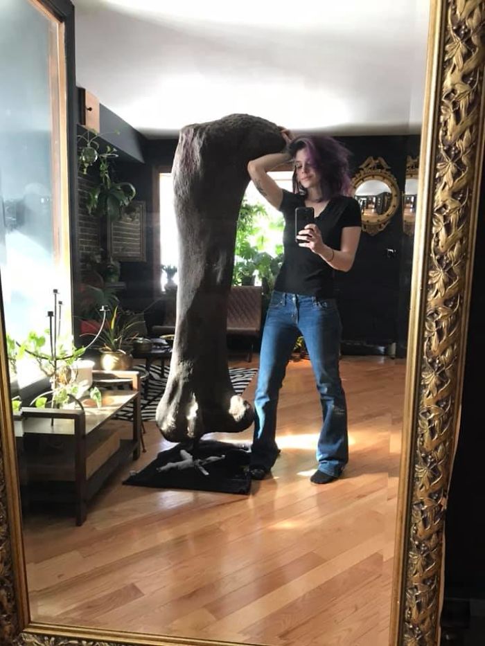 Ma nieco ponad 6 stóp (około 185 cm) i jest z włókna szklanego. Znalazłem go z koleżanką w antykwariacie w Pocono za nieco ponad 160$. Pierwszy raz zostawiłem go, zastanawiając się „czy naprawdę potrzebuję kości dinozaura?” — żałowałem tego cały tydzień. Gdy targ ponownie otwarto, w śnieżycę po niego wróciłem i teraz stoi w moim salonie.