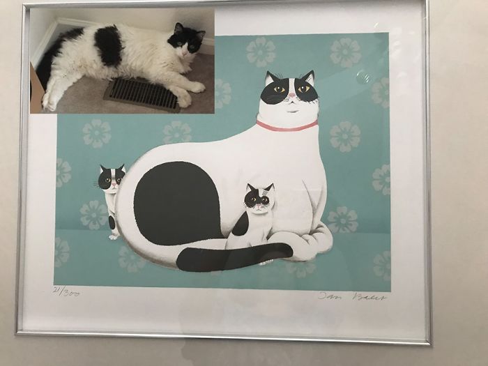 Dwa miesiące temu zmarła moja 20-letnia kotka. Po tylu latach byłem zdruzgotany. Wczoraj trafiłem do Salvation Army i znalazłem to cudo. Wkleiłem zdjęcie mojej kotki, żebyście zobaczyli, jak idealnie to pasuje — to po prostu ona!
