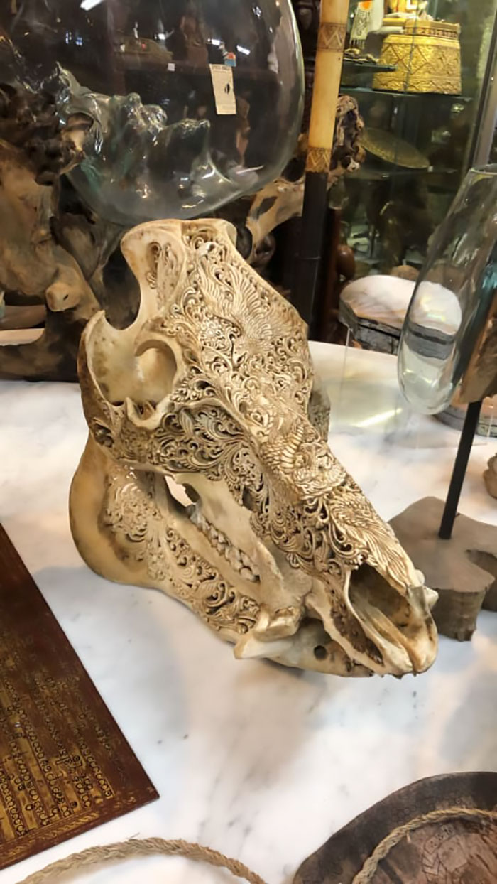 Pięknie i misternie rzeźbiona czaszka z galerii Asiabarong, Great Barrington, MA