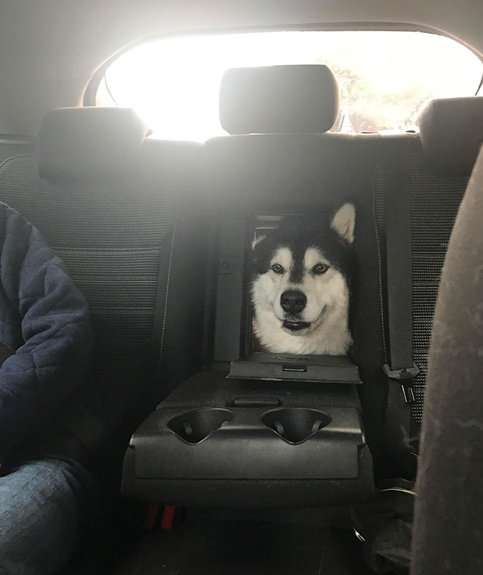 Malamut jedzie samochodem