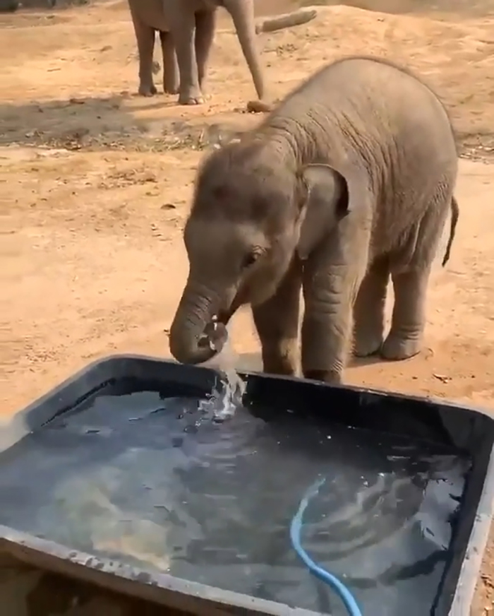Choć noworodki potrafią szybko stać i chodzić (nawet w kilka godzin po urodzeniu), opanowanie umiejętności czerpania wody trąbą zajmuje im zwykle około roku — przez ten czas eksperymentują i uczą się kontrolować jej precyzję.