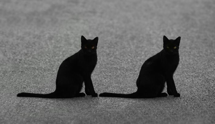 Dwa czarne koty. Jeden uwielbia zapasy z psem w stylu WWE, drugi nie chce, żeby pies nawet patrzył w jego stronę. Pies je często myli.