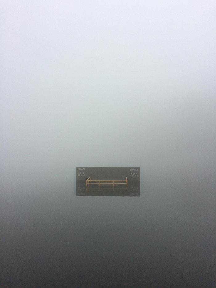 Zrobione przeze mnie zdjęcie mgły nad jeziorem sprawia, że znak ostrzegawczy wygląda, jakby unosił się w nicości