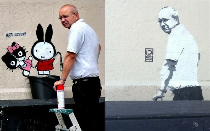Ds Bad Kitty Graffiti Removed Then The Worker Who Removed It Reappears In Its Place. Islington, London, UK [620×387]