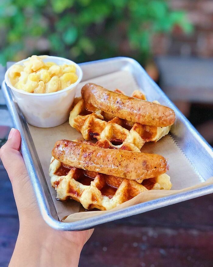 Pikantny kurczak i kiełbasa andouille na gofrze z cukrem perłowym, polane syropem klonowym — aż ślinka leci