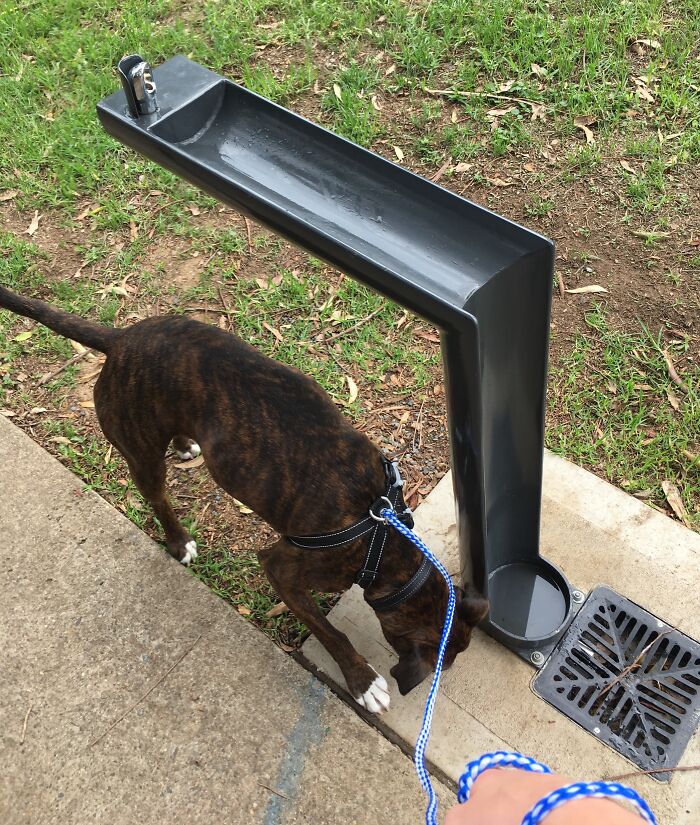 Wbudowana w ścieżkę ulica fontanna pozwala psom napić się podczas spaceru — praktyczne i estetyczne rozwiązanie w przestrzeni publicznej.