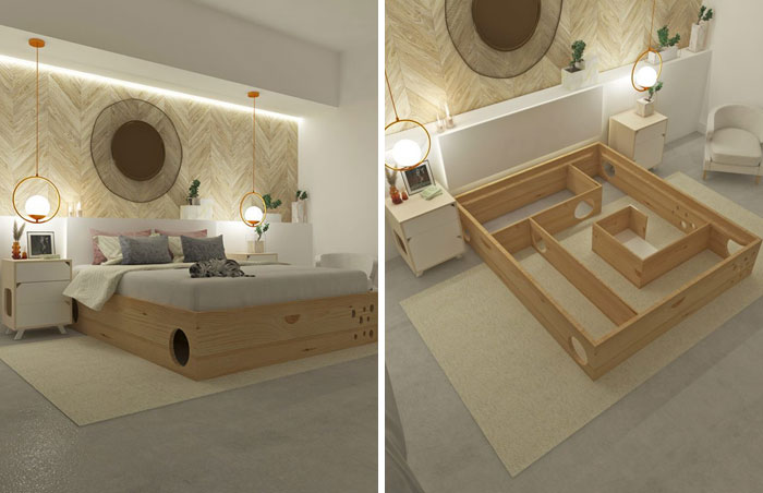 Designerskie rozwiązanie łączące wygodę ludzi i kotów — łóżko z wbudowanymi przestrzeniami dla kota, by spał blisko właściciela.