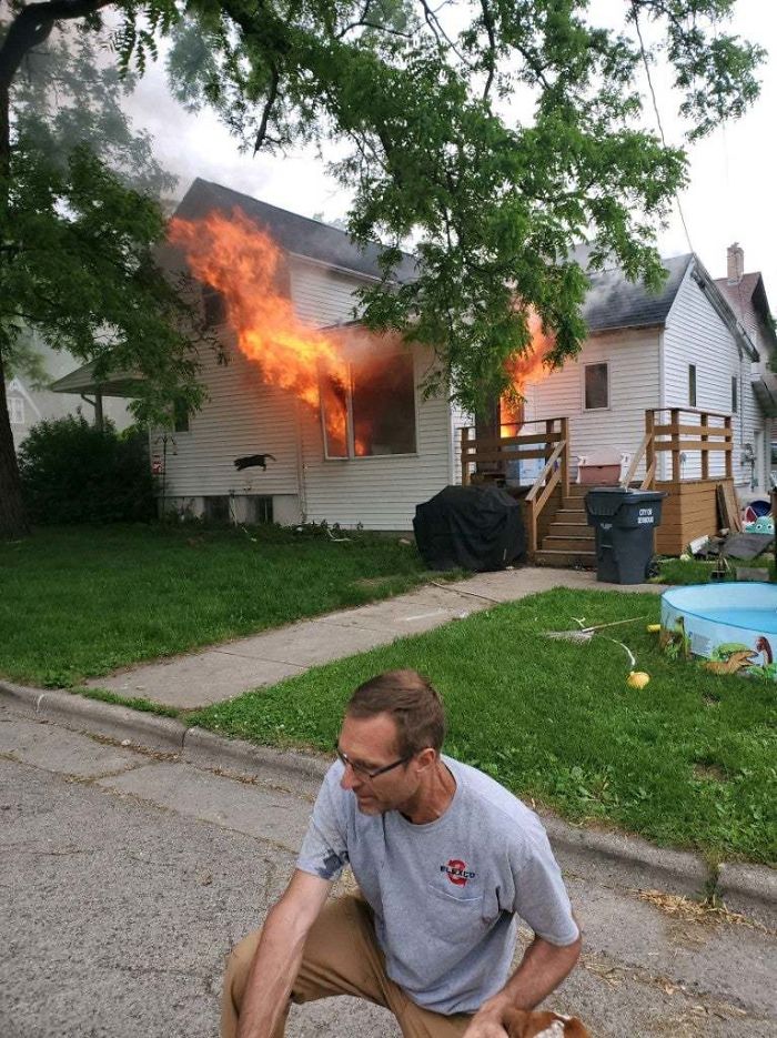 Facet uratował naszego psa — w tle widać kota wyskakującego z okna