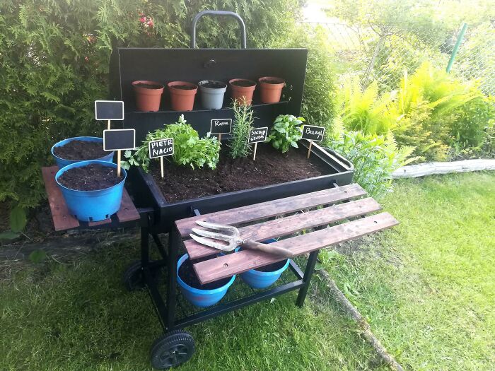 Stary grill przerobiony na mały ogródek z ziołami
