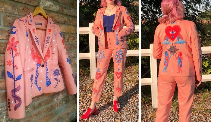 Malarstwo na tkaninie dało unikalny efekt i zapobiegło wyrzuceniu używanego garnituru — czasochłonny, ale satysfakcjonujący projekt artystyczny.