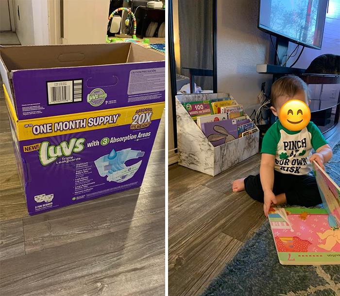 Pudełko po pieluszkach i okleina samoprzylepna jako mała biblioteczka dla syna