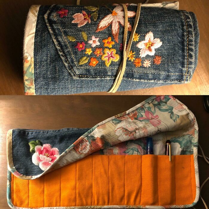 Fragmenty ulubionych spodni, zamiast leżeć w szufladzie, zyskały drugie życie jako praktyczne etui na przybory do pisania.