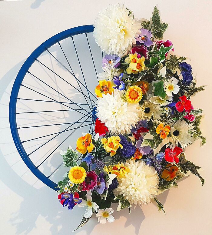 Koło z roweru zostało wykorzystane jako element dekoracyjny lub konstrukcyjny — pomysł na industrialne akcenty w ogrodzie lub wnętrzu.