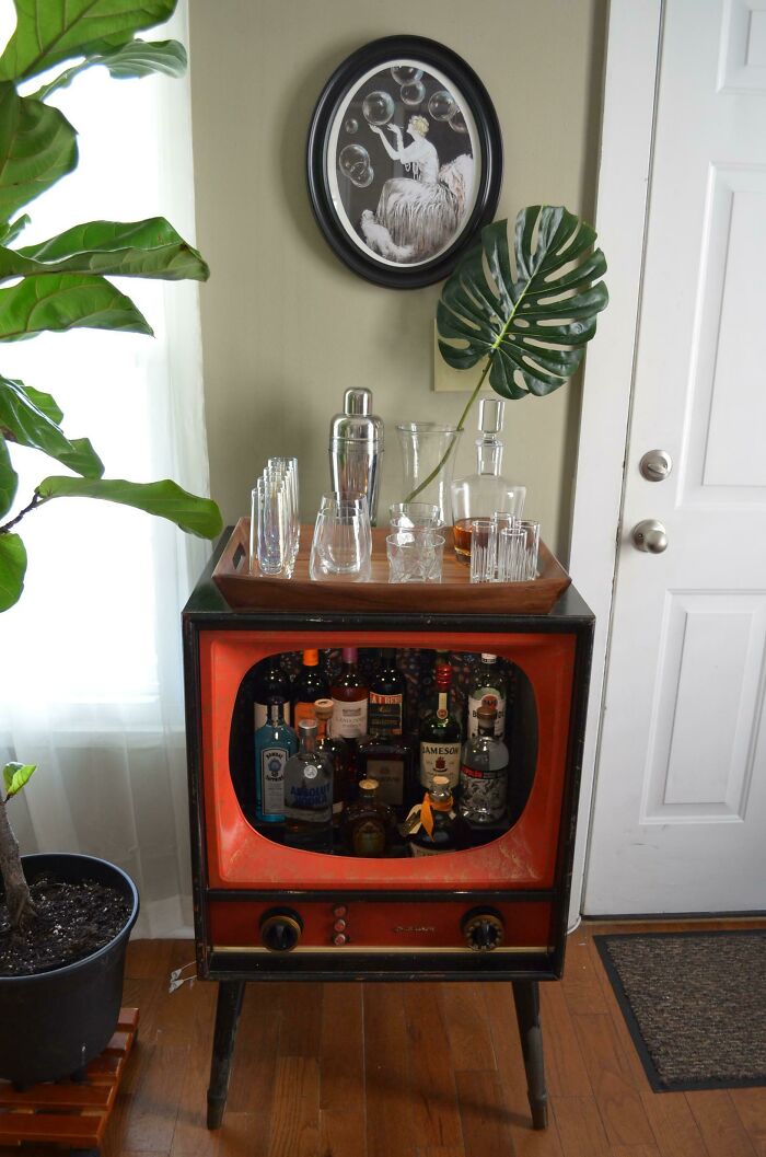 Zabawne i pomysłowe wykorzystanie obudowy vintage — po renowacji i dodaniu praktycznych półek powstał stylowy barek na kółkach.