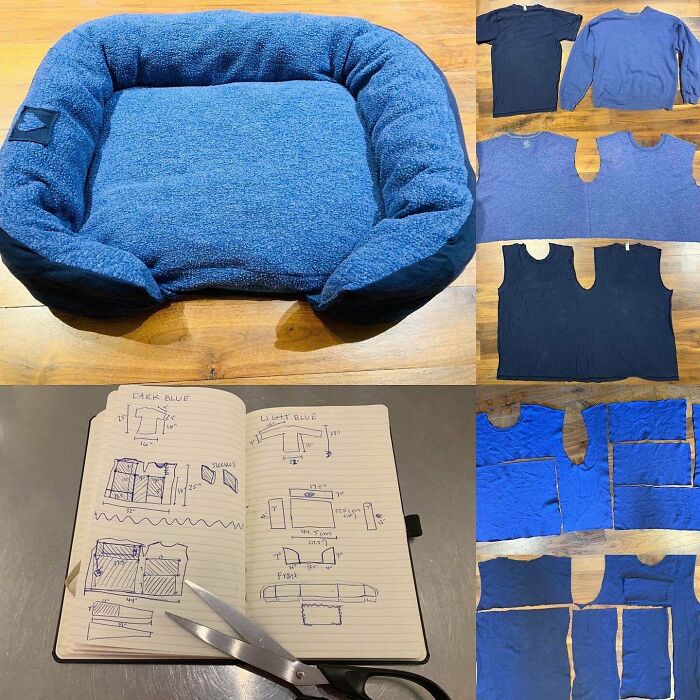 Gdy używana odzież wygląda lepiej na zdjęciu niż w rzeczywistości, można ją rozpruć i przerobić na coś funkcjonalnego — w tym przypadku miękkie legowisko dla pupila.