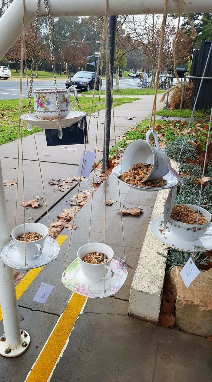 Uroczy projekt ogrodowy — stare filiżanki zawieszone na drucie tworzą małe, klimatyczne poidełka i karmniki.