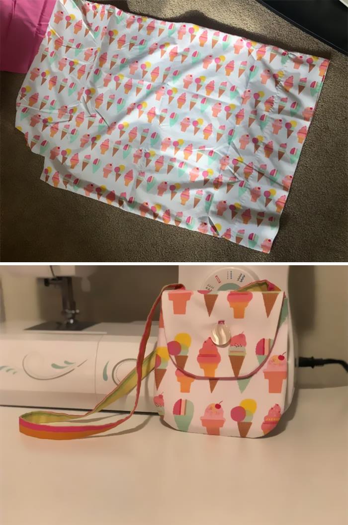Za grosze znaleziona poszewka została uszyta w małą, stylową torebkę — tani i oryginalny sposób na akcesorium.