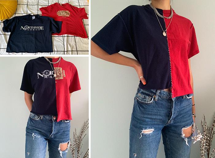 Skrawki materiału z kilku wyeksploatowanych t-shirtów zszyte razem dały ciekawą, trwałą koszulkę o niestandardowym designie.