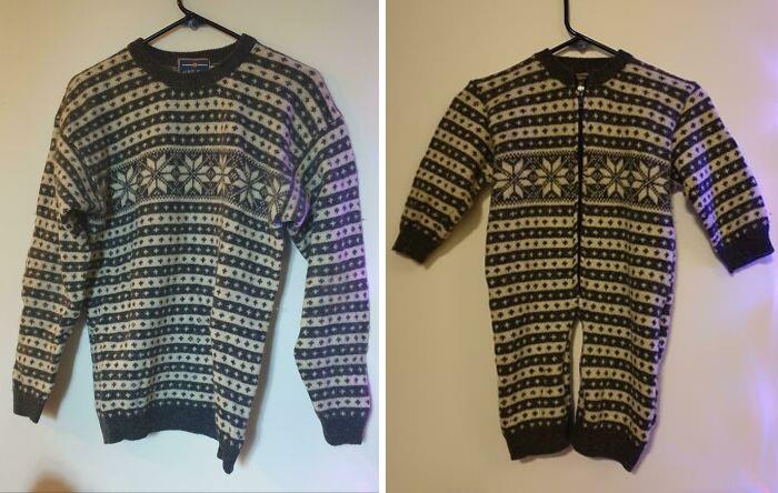 Stary sweter i zamek z torby — wełniany ogrodniczek dla dziecka