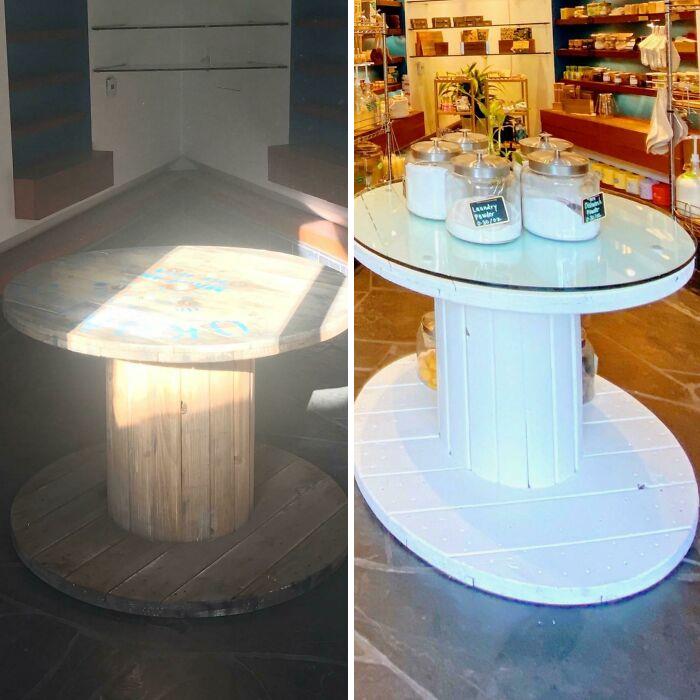 Stary bęben kablowy jako stolik do sklepu zero waste