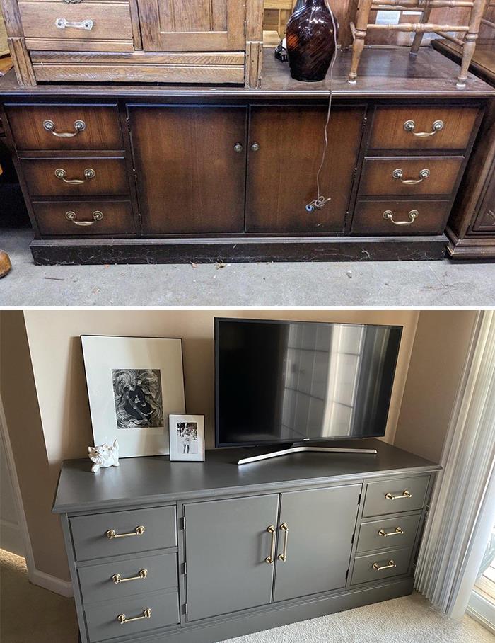 Przekształcenie mebla użytkowego w elegancki mebel RTV — dobry przykład, jak odrobina pracy stolarskiej i farby potrafi odmienić wnętrze.