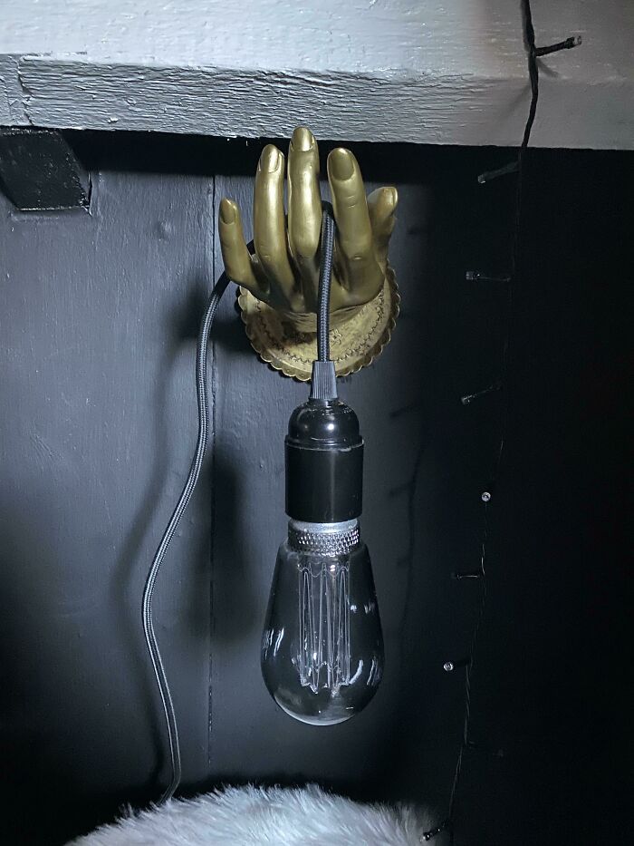 Ręka manekina i złota taca jako lampa