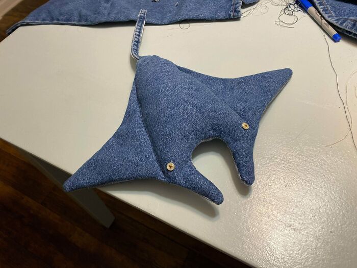 Stare nogawki i kieszenie posłużyły do uszycia uroczych pluszaków — idealne jako pamiątka i sposób na recykling tkanin.