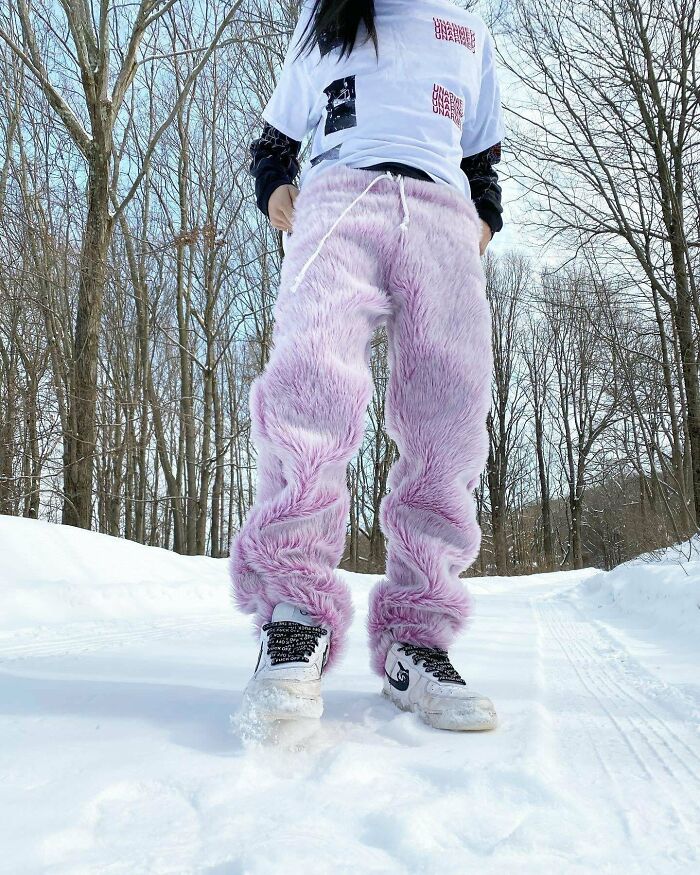 Grubszy materiał z używanego koca posłużył do uszycia ciepłych, nietypowych spodni — wygodnych i przytulnych.
