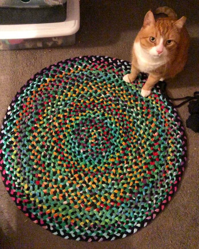 Pozbierane i splecione stare t-shirty zamieniły się w miękki, kolorowy dywan — świetny sposób na recykling tekstyliów i oryginalna dekoracja domu.