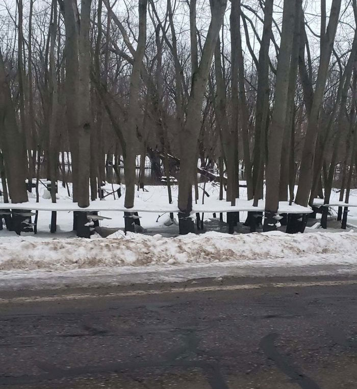 Lodowe półki wiszące na drzewach po zalaniu i zamarznięciu rzeki