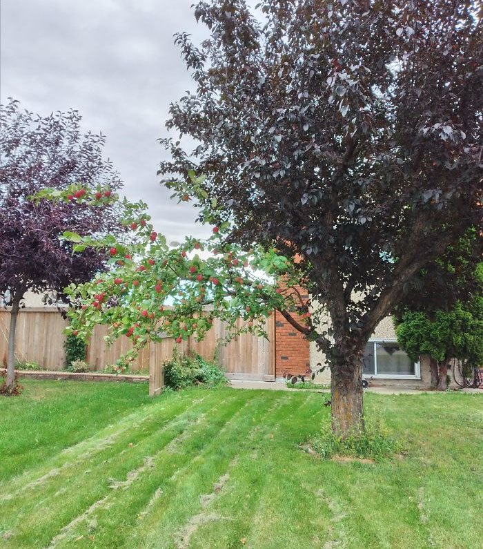 Drzewo w sąsiedztwie z jedną gałęzią jabłoni
