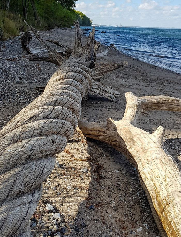 Ukształtowane przez fale i czas drewno ma niemal rzeźbiarską formę — natura jako artysta.