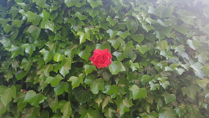 Co roku jedna czerwona róża wyrasta przez mur bluszczu
