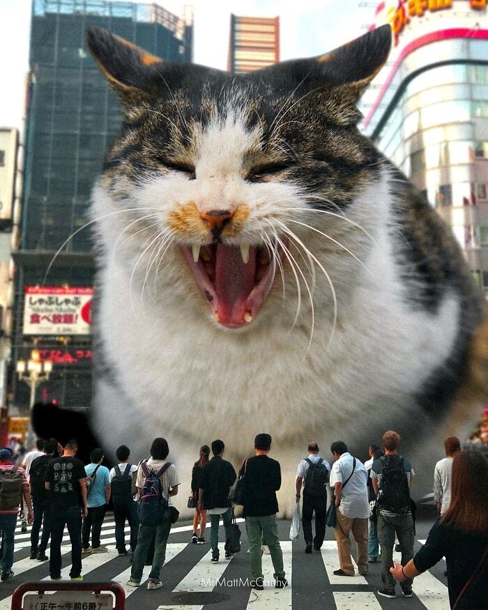 W tej czwartej części swojego popularnego projektu Matt wplata ogromne, puszyste koty w codzienne sceny – drzemiące na dachach, blokujące ruch uliczny lub swobodnie przejmujące parki i stacje benzynowe. Efekty są zarówno surrealistyczne, jak i urocze, pokazując, jak wyglądałoby życie, gdyby nasi koci przyjaciele rządzili miastem (dosłownie).