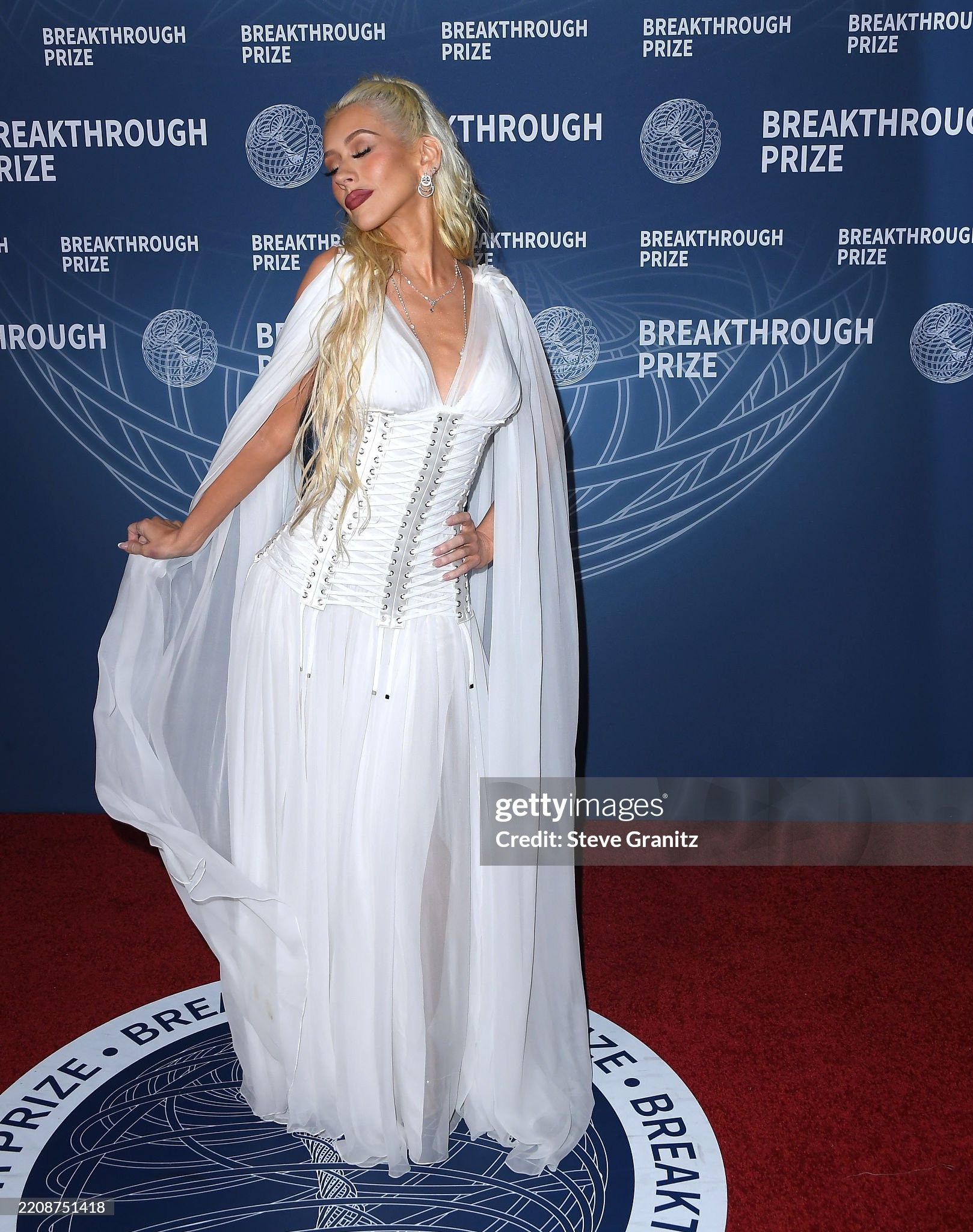 44-letnia Christina Aguilera pojawiła się w eterycznej odsłonie Dolce & Gabbana na ceremonii Breakthrough Prize 2025 w Los Angeles. Pewnie stojąc obok swojego partnera, Matthew Rutlera, miała na sobie białą sukienkę z szyfonu z kolekcji marki na wiosnę 2024 roku, z głębokim dekoltem, półprzezroczystymi rękawami w kształcie peleryny i detalami w postaci gorsetu.
